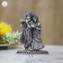 This is a beautiful antique statue of Lord Krishna and Radha made from pure silver. Radha is leaning on Krishna, showing their deep love. The statue is decorated with beautiful green and purple stones. It is a perfect piece of art to bring peace and love to your home.