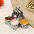 Embellished with a captivating 925 Antique Silver Lakshmi figurine and adorned by graceful peacocks, this solid silver Haldi Kumkum Karanda. The Goddess Lakshmi statue is carefully crafted to depict her divine elegance and blessings. The Karanda's spiritual importance is heightened by the peacocks, valued for their beauty and positive symbolism.
