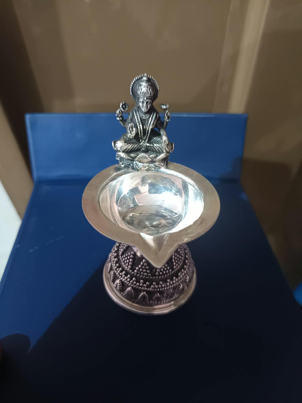 Experience the spiritual elegance of our925 Antique Silver Niranjan With Lakshmiji, a timeless piece that combines artistry and devotion. Adorned with a graceful figurine of Goddess Lakshmi at the top, this diya is a symbol of prosperity and abundance. Bring the blessings of Goddess Lakshmi into your life with our divine silver Niranjan.